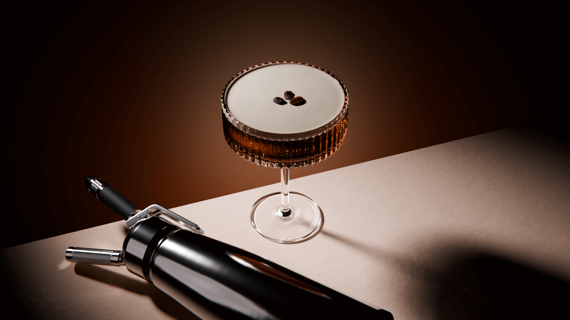 • A starkly lit Espresso Martini Cocktail next to a cocktail dispenser